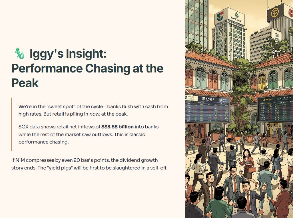 We are currently in the “sweet spot” of the cycle, where banks are flush with cash from high-interest rates. But retail investors are piling in now—at the peak. SGX data shows retail net inflows of S$3.88 billion into banks while the rest of the market saw outflows. This is classic “performance chasing.” You aren’t buying a dividend; you are buying a crowded trade. If NIM compresses by even 20 basis points, the dividend growth story ends, and the “yield pigs” will be the first to be slaughtered in a sell-off.