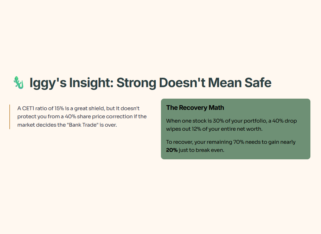 The balance sheets are undeniably strong, but don’t let a “Pass” grade fool you into complacency. A CET1 ratio of 15% is a great shield, but it doesn’t protect you from a 40% share price correction if the market decides the “Bank Trade” is over. When one stock is 30% of your portfolio, a 40% drop wipes out 12% of your entire net worth. To recover that, you’d need your remaining 70% to gain nearly 20% just to get back to zero.