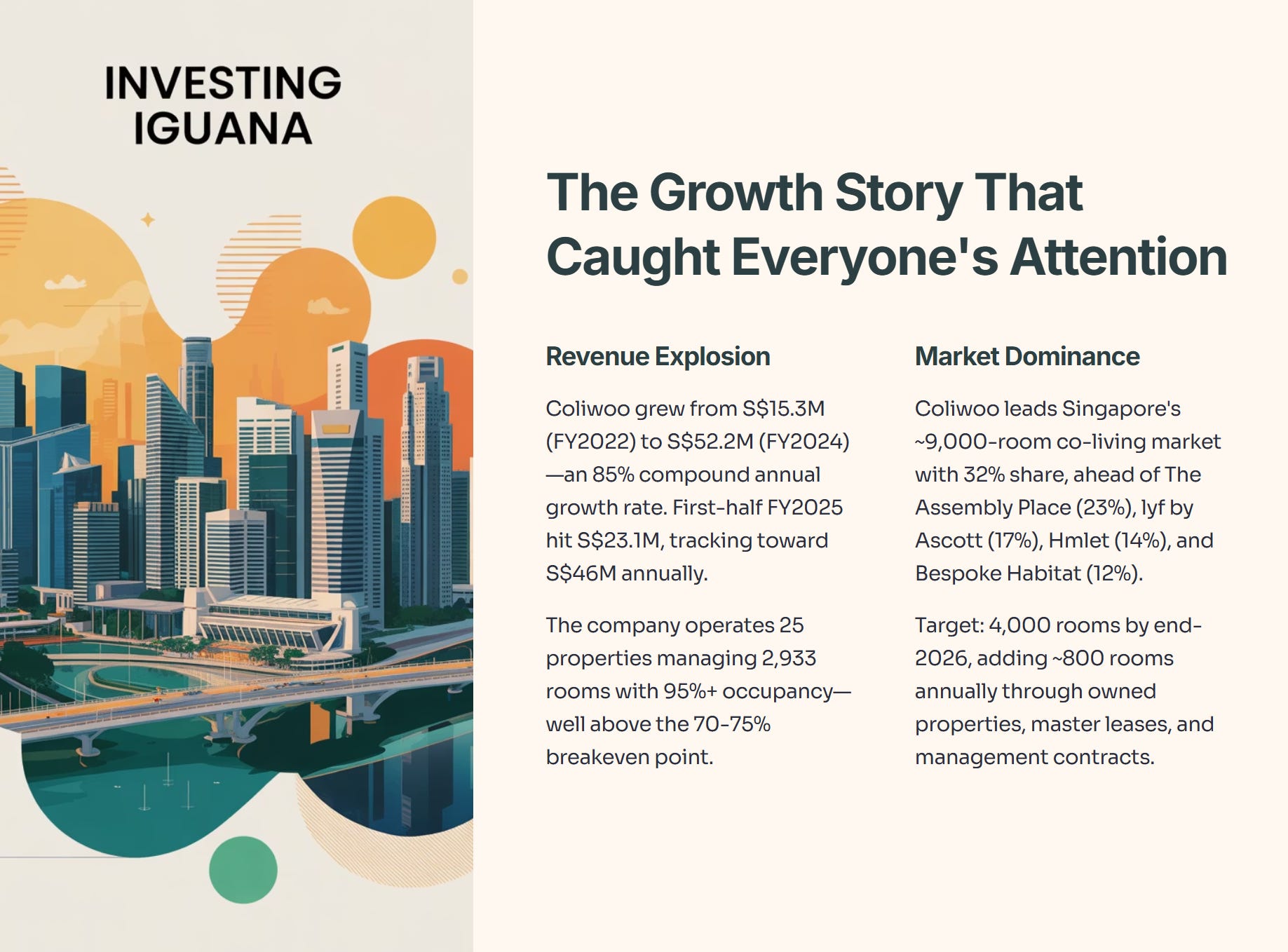 The business operates 25 properties across Singapore, managing 2,933 rooms with an average occupancy rate exceeding 95%. This occupancy level sits well above the industry breakeven point of 70-75%. The company dominates Singapore’s co-living market, which contains roughly 9,000 total rooms across 20 active operators.