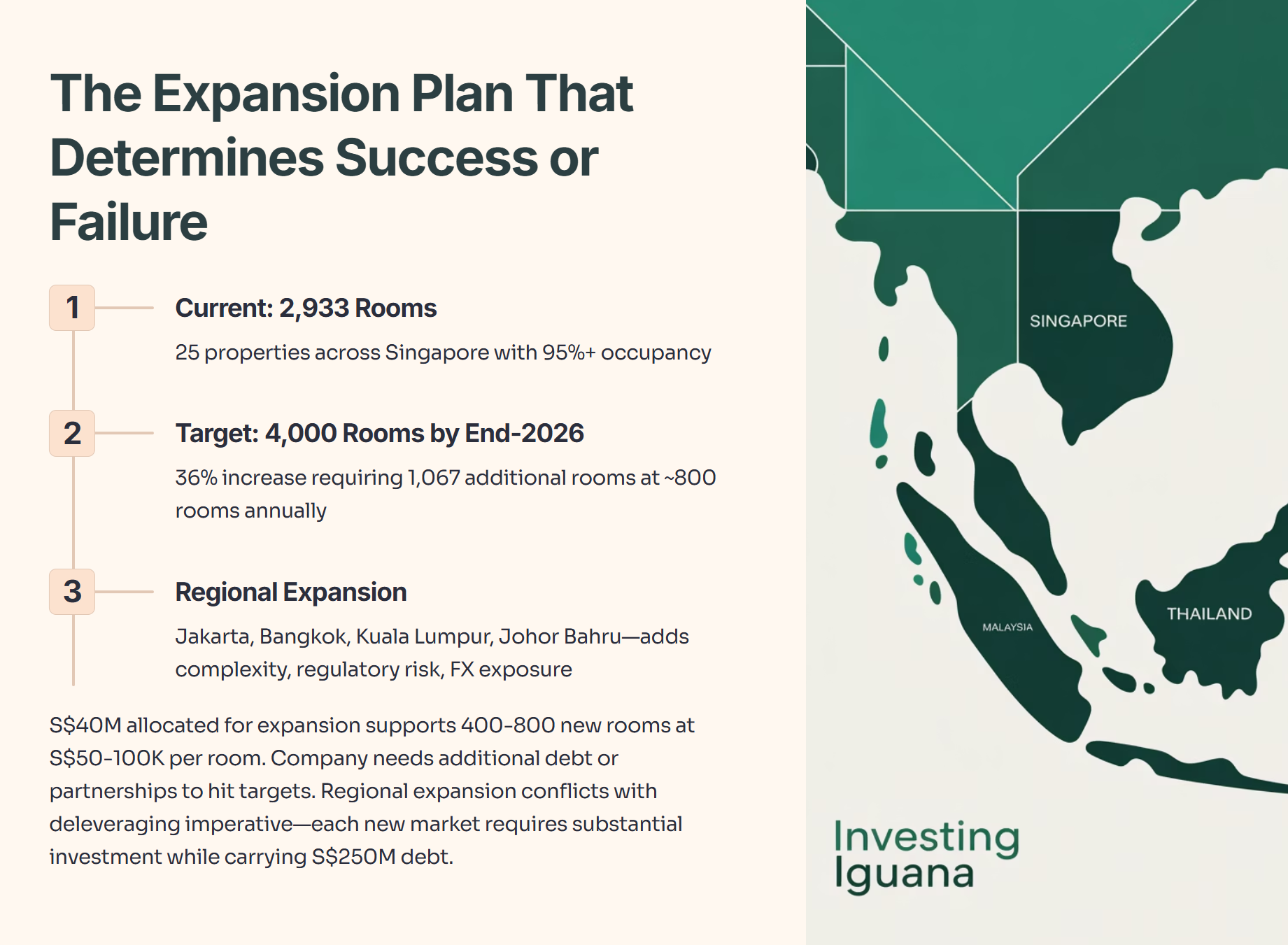 The regional expansion strategy conflicts with the deleveraging imperative. Each new market requires substantial investment in brand building, property sourcing, regulatory compliance, and operational infrastructure. Spreading capital across five countries while carrying S$250 million in debt creates execution risk that could derail the entire story.