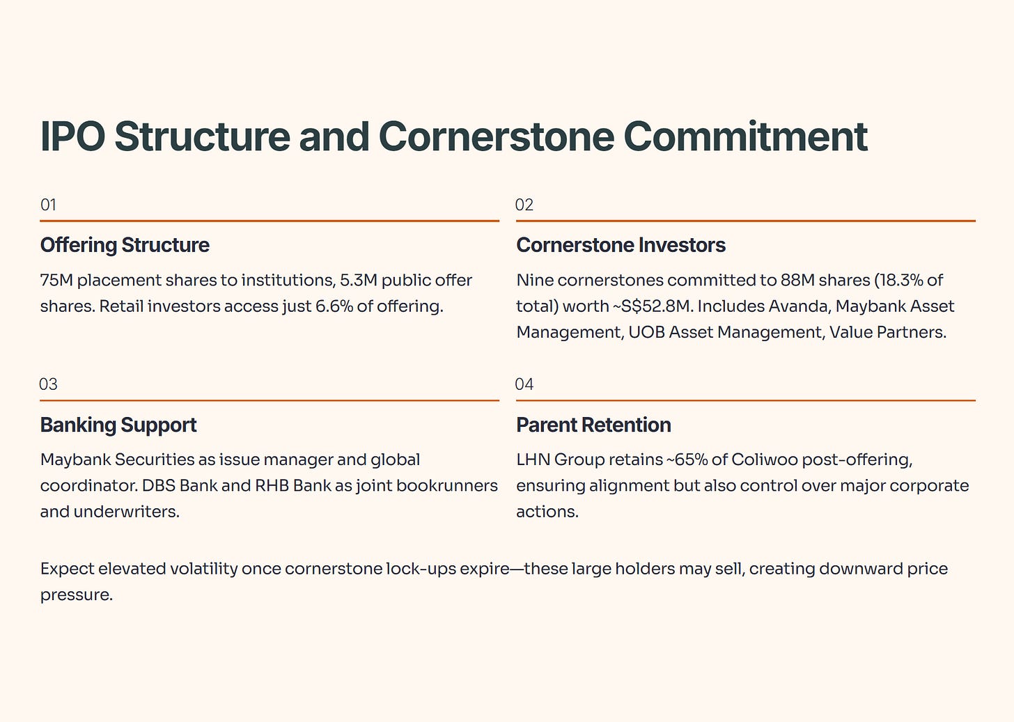 Nine cornerstone investors committed to 88 million shares at the offering price, representing 18.3% of total shares issued at listing. These cornerstones include Avanda Investment Management, Maybank Asset Management Singapore, UOB Asset Management, Value Partners Hong Kong, and others. The cornerstone participation totals approximately S$52.8 million and demonstrates institutional confidence.