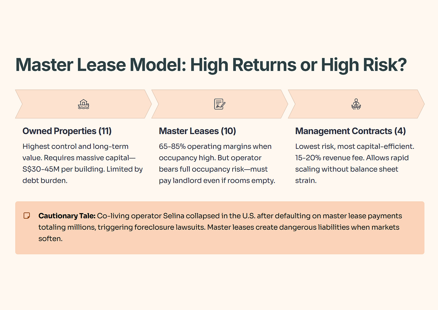 But master leases create significant downside risk. The operator bears full occupancy risk and must pay the landlord even if rooms sit empty. When markets soften, master lease obligations become dangerous liabilities. Co-living operator Selina’s collapse in the United States provides a cautionary tale—the company defaulted on master lease payments totaling several million dollars, triggering foreclosure lawsuits and property takeovers.