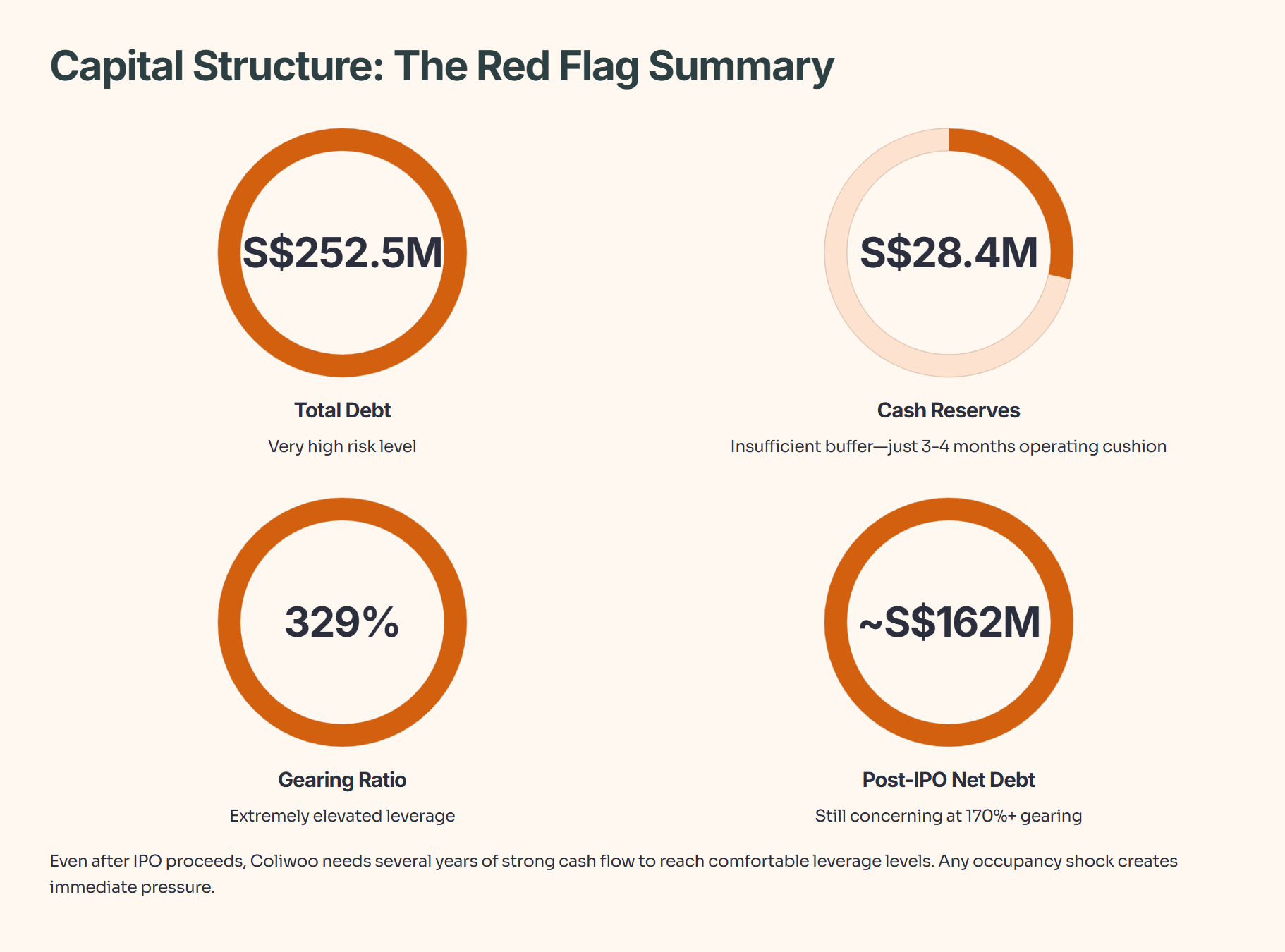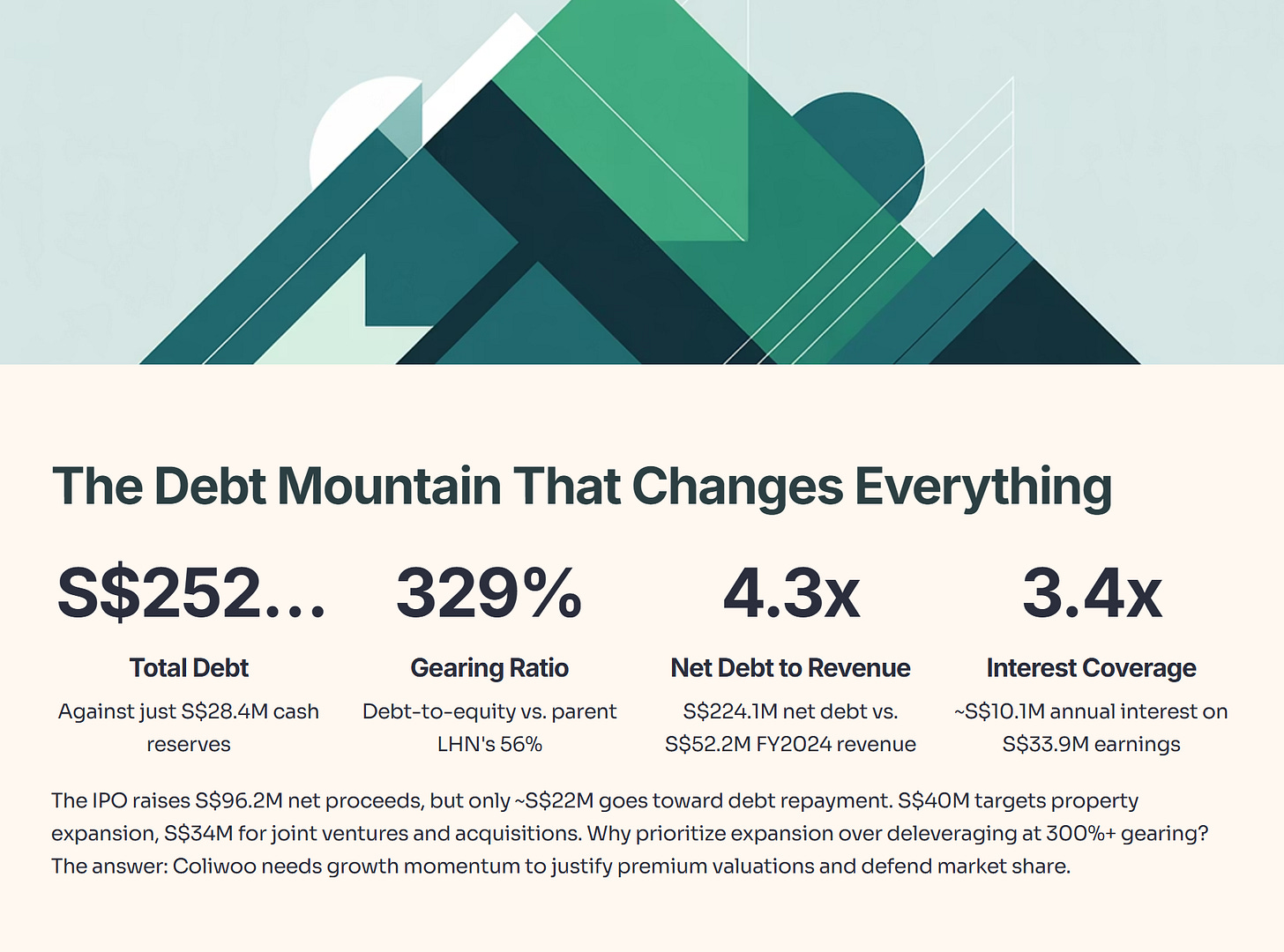 But beneath the impressive growth story lies a financial reality that demands your attention. Coliwoo carries S$252.5 million in debt against just S$28.4 million in cash. The company’s gearing ratio stands at a staggering 329%. This IPO isn’t just about growth—it’s about survival and deleveraging.