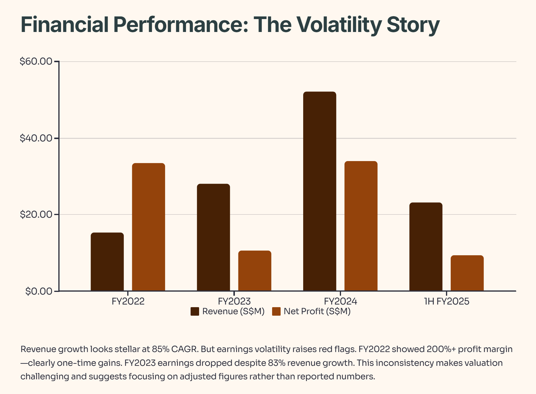 FY2023 earnings dropped to S$10.5 million despite 83% revenue growth. FY2024 rebounded to S$33.9 million, then first-half FY2025 came in at S$9.3 million. This earnings inconsistency makes valuation challenging and suggests investors should focus on the adjusted S$13 million figure cited by analysts rather than reported numbers.