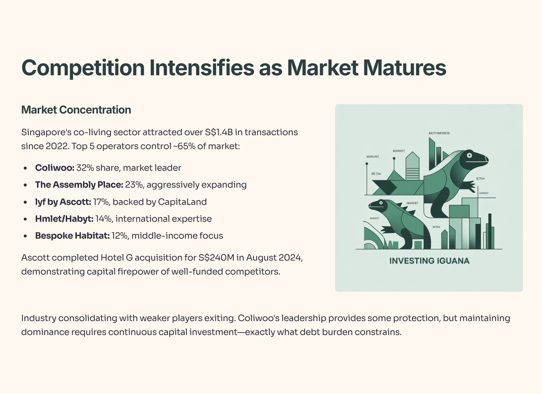 Perhaps most concerning for Coliwoo, hospitality giant Ascott—a CapitaLand subsidiary—operates the lyf brand with 17% market share. Ascott completed the acquisition and conversion of Hotel G into lyf Bugis for S$240 million in August 2024. This demonstrates the capital firepower available to well-funded competitors.