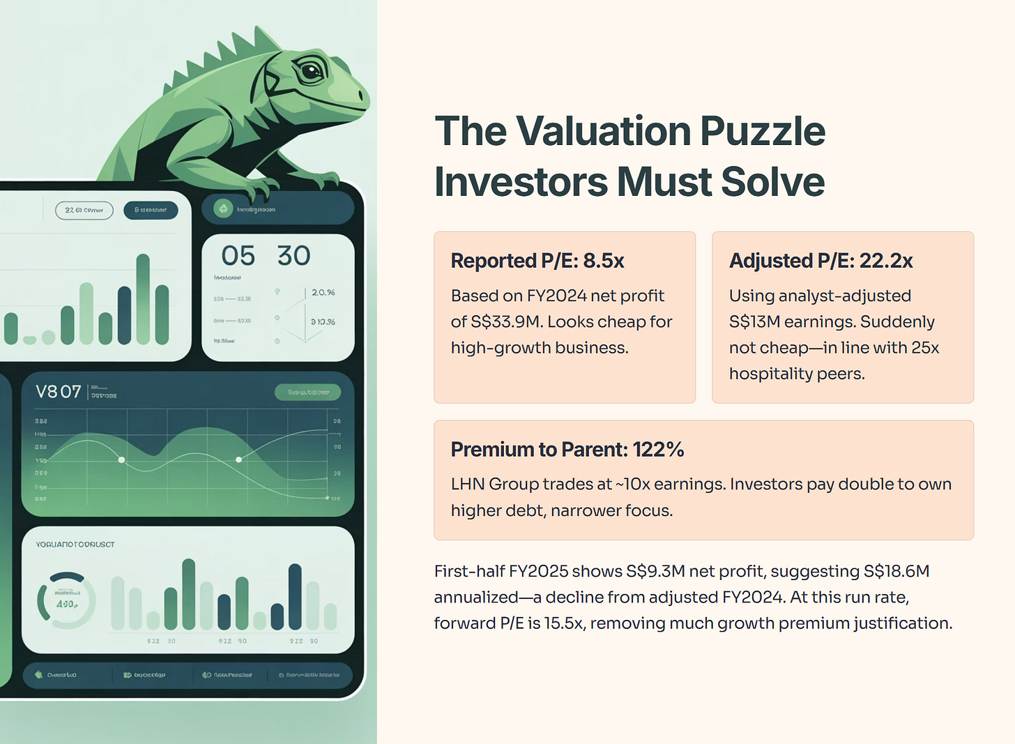 The company reported FY2024 net profit of S$33.9 million, which produces a price-to-earnings ratio of 8.5 times based on the IPO market cap. That sounds reasonable—even cheap—for a high-growth business. But analyst reports suggest using an “adjusted” FY2024 net profit of S$13 million for valuation purposes. This adjustment likely removes one-time gains or non-recurring items.