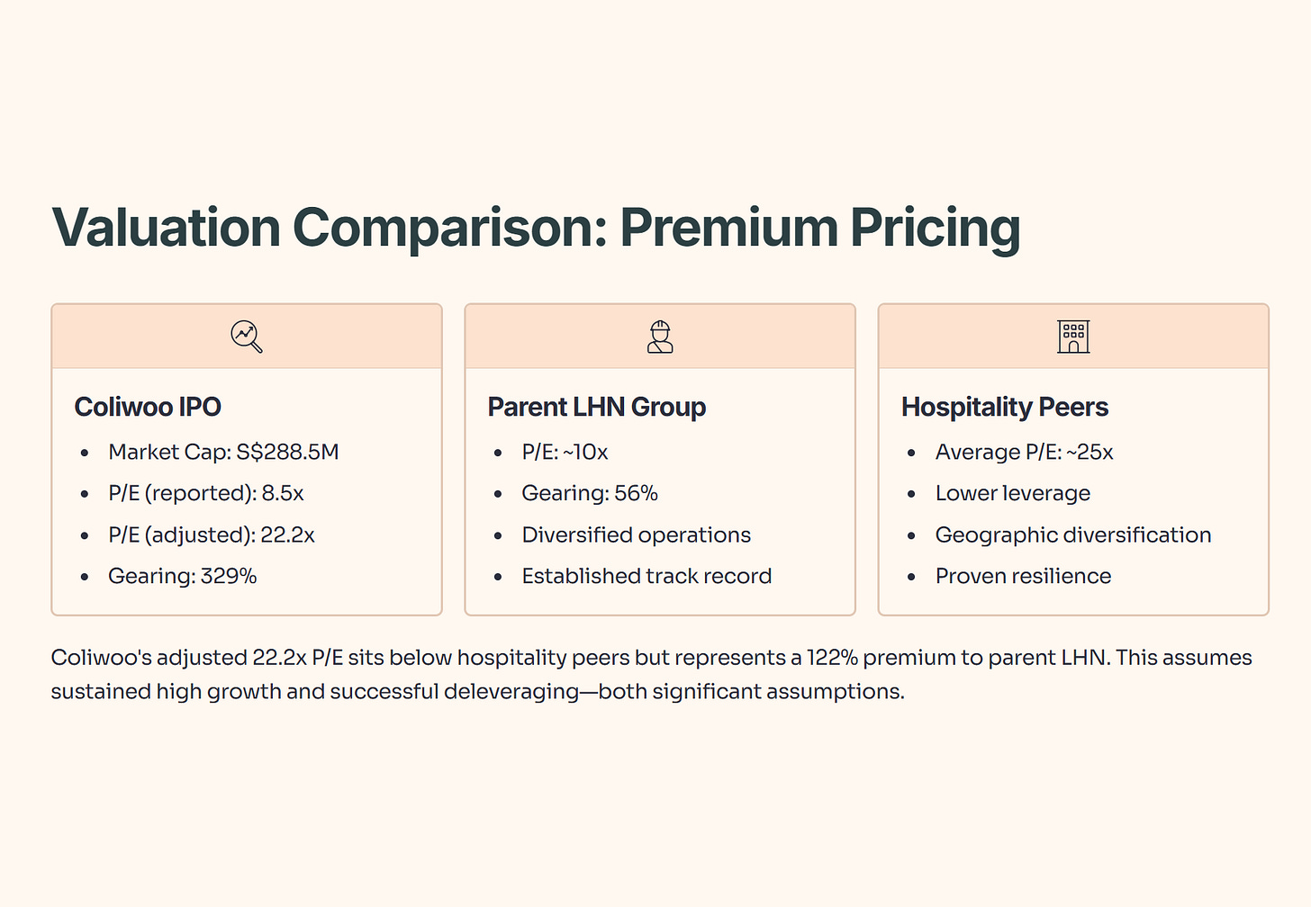 The real comparison point is parent company LHN Group, which trades at roughly 10 times earnings on the Singapore Exchange. Coliwoo’s IPO pricing represents a 122% premium to its parent. Investors are essentially paying more than double LHN’s valuation multiple to own a business with higher debt, narrower geographic focus, and greater exposure to Singapore’s competitive co-living market.
