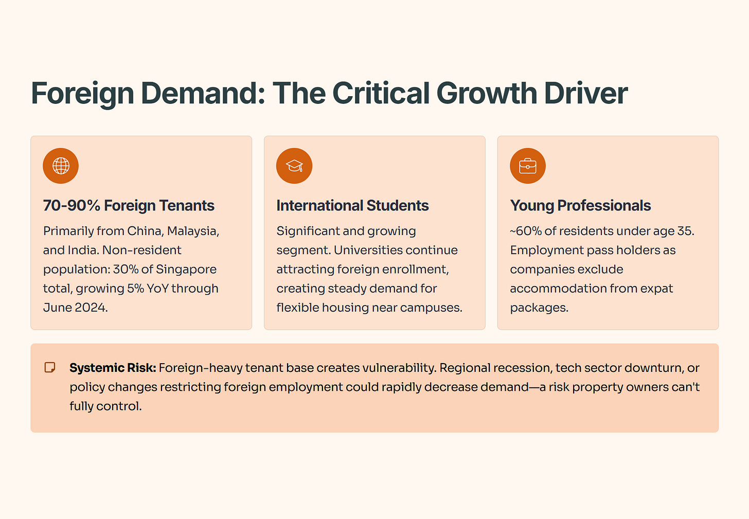 Understanding who rents co-living spaces matters enormously for investment analysis. Foreigners comprise 70-90% of co-living tenants in Singapore, primarily from China, Malaysia, and India. The non-resident population represents 30% of Singapore’s total population and grew 5% year-over-year through June 2024, maintaining a five-year compound annual growth rate of 1.1%.