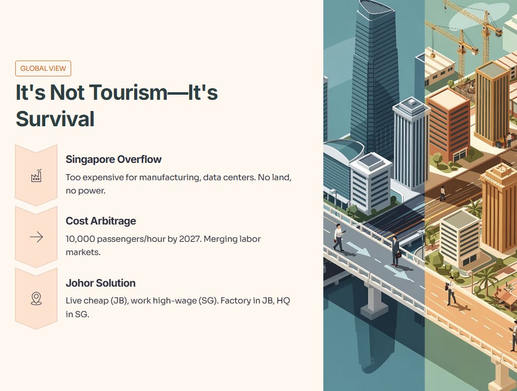 Singapore is becoming too expensive for low-margin manufacturing and energy-hungry data centers. We simply don’t have the land or the power. Johor does.