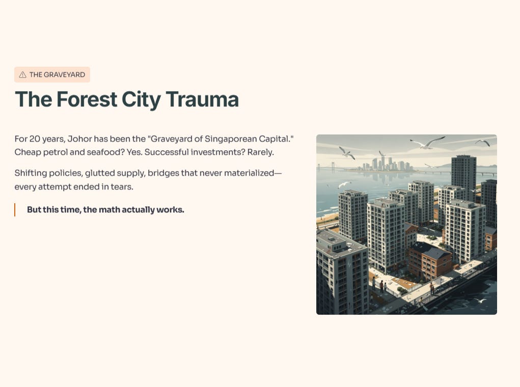 I get it. For 20 years, Johor has been the “Graveyard of Singaporean Capital.” We go there for cheap petrol and seafood, but every time we try to invest, we get burned by shifting policies, glutted supply, or bridges that never get built.