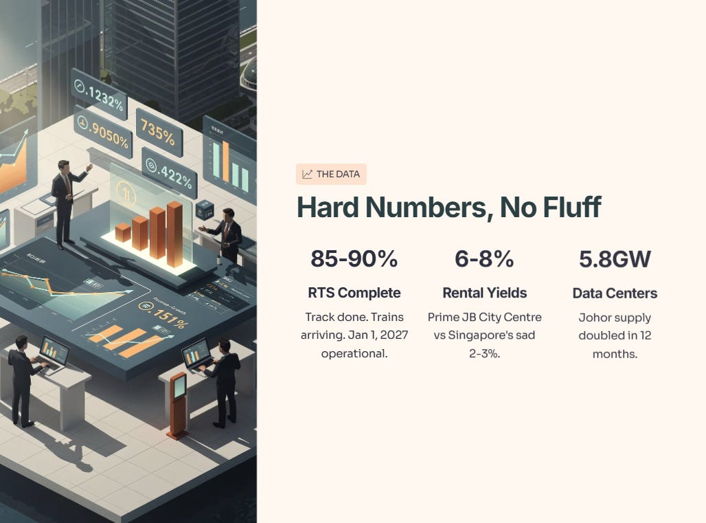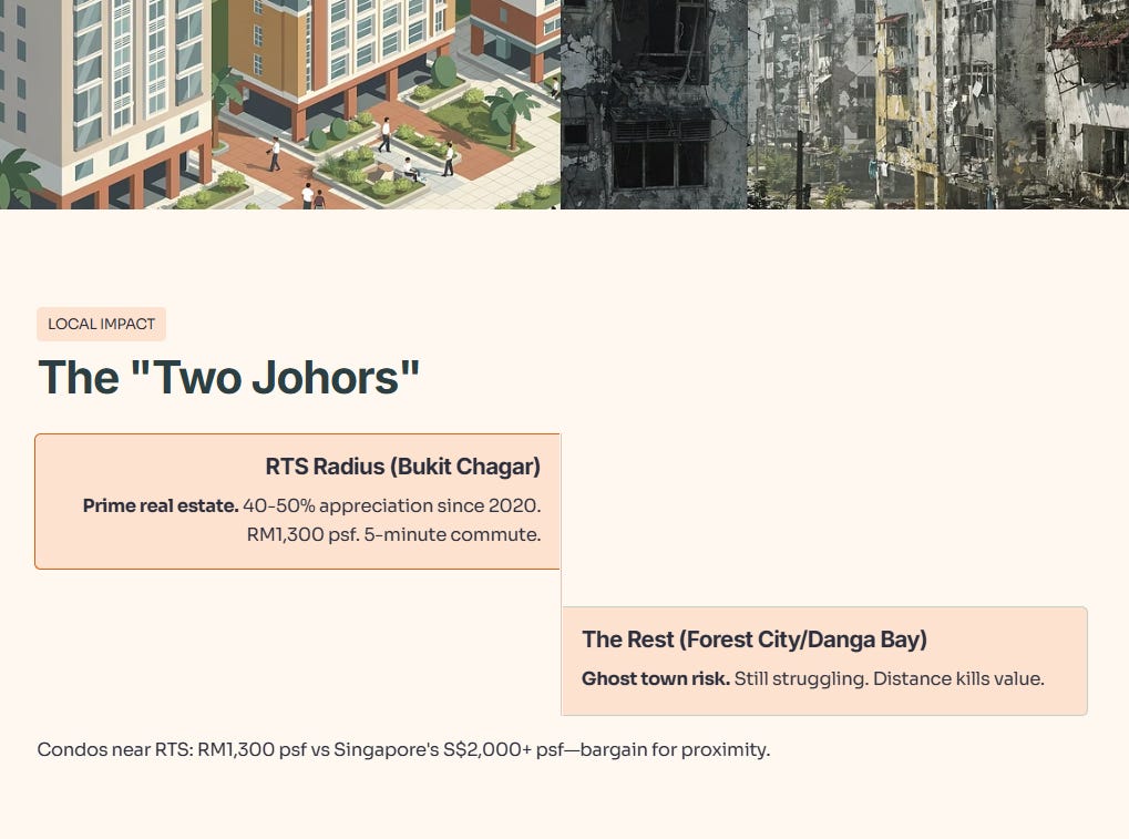 The data shows that condos near the RTS are hitting RM1,300 psf. That sounds high for Malaysia, but compared to Singapore’s S$2,000+ psf, it’s a bargain for a 5-minute commute.
