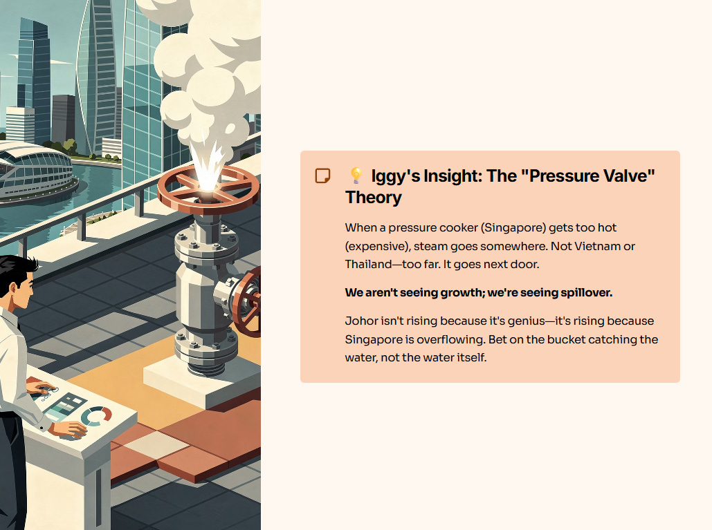 We aren’t seeing “growth”; we are seeing spillover. Johor isn’t rising because it’s a genius economy; it’s rising because Singapore is overflowing. Bet on the bucket that catches the water, not the water itself.