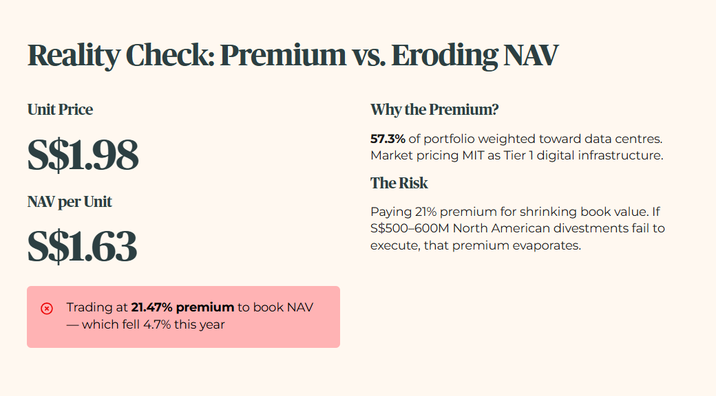 The market is pricing MIT as a Tier 1 digital infrastructure asset. That is largely because 57.3 percent of its portfolio is now weighted toward data centres. The Singapore portfolio acts as a heavy anchor, delivering 6.2 percent rental reversions. However, the NAV has eroded by 4.7 percent over the past year. You do not buy a yield in isolation. You buy the sustainability of the cash that fuels it. Paying a 21 percent premium for an asset whose book value is shrinking is a calculated risk. Management’s guidance targets selective divestments of S$500 million to S$600 million in North America to rebalance the portfolio toward cloud and hyperscale tenants. If they fail to execute, that premium will evaporate quickly.