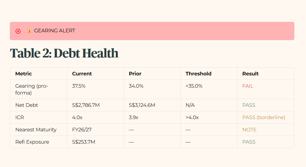 The balance sheet is showing cracks. The pro-forma gearing of 37.5 percent fails the 35.0 percent fortress standard. The Interest Coverage Ratio of 4.0 times sits exactly at the threshold — not a failure, but there is zero margin for error. The S$253.7 million refinancing exposure for FY26/27 is manageable, but the S$600 million interest rate swap wall is a looming structural threat.