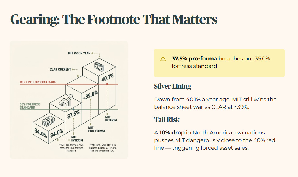 First, the raw fact. Pro-forma gearing is climbing to 37.5 percent. Second, the historical benchmark. This is actually an improvement from the 40.1 percent recorded a year ago. Third, the peer context. CLAR is sitting higher at approximately 39.0 percent. MIT still wins the balance sheet war. Fourth, the forward scenario. A 10 percent drop in the North American portfolio valuation would push MIT dangerously close to the 40 percent red line. That triggers forced asset sales. Fifth, the wallet impact. For CPF Ordinary Account investors seeking absolute capital preservation, this elevated gearing increases the risk profile of the trust significantly.