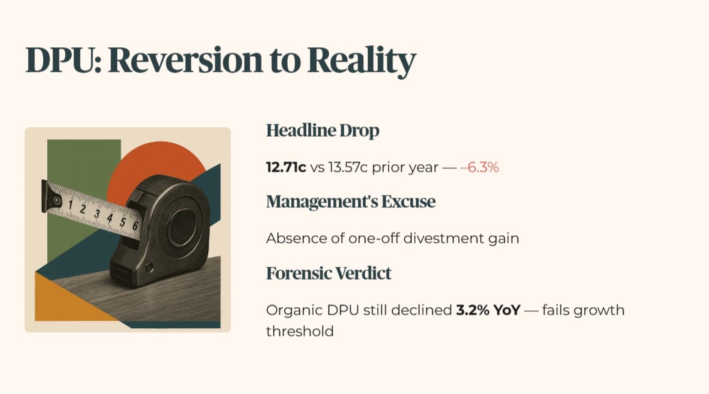The headline DPU dropped to 12.71 cents from 13.57 cents the year prior. Management called this the absence of a one-off divestment gain. The forensic audit calls it a reversion to reality. Even stripping out the divestment gain, the organic DPU declined by 3.2 percent year-on-year. This 6.3 percent headline drop fails our growth threshold.