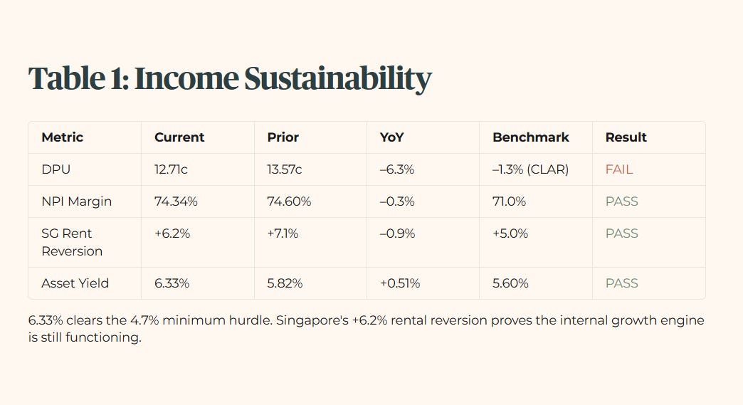 The 6.33 percent yield clears the 4.7 percent minimum hurdle. The 6.2 percent rental reversion in Singapore proves the internal growth engine is still functioning.