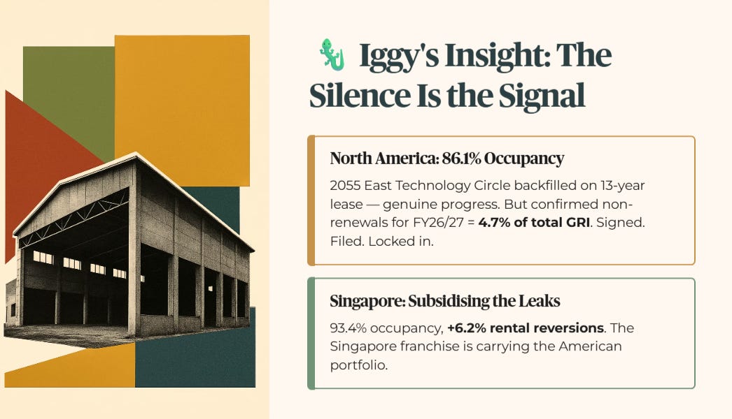 Management spent minimal time discussing the 86.1 percent occupancy rate in their North American data centre portfolio. The backfilling of 2055 East Technology Circle in Tempe with a 13-year lease is genuine operational progress. But the silence on confirmed non-renewals is the louder signal. Of the leases expiring in FY26/27, approximately 4.7 percent of total portfolio gross rental income has already confirmed it will not renew. That is not a theoretical risk in a stress-test table. It is a signed decision sitting in a filing. The Singapore assets are operating at a solid 93.4 percent occupancy and generating 6.2 percent rental reversions. They are subsidising the American leaks. Until management fills those overseas powered shells with hyperscale tenants, the distribution is walking with a limp.