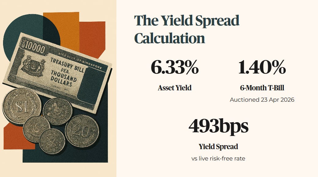 We calculate the true risk premium. The current asset yield is 6.33 percent. The 6-month T-Bill, last auctioned on 23 April 2026, cleared at 1.40 percent per annum. Against the live risk-free rate, MIT’s yield spread is approximately 493 basis points — which sounds generous until you apply the forensic stress test.