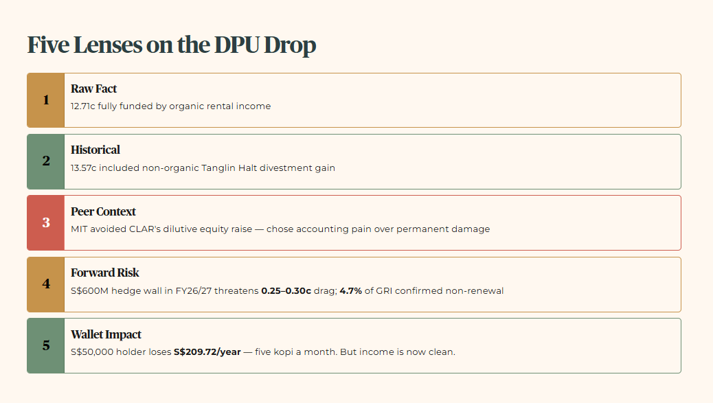 First, the raw fact. The FY25/26 DPU of 12.71 cents was fully funded by organic rental income. Second, the historical benchmark. Last year’s 13.57 cents included a non-organic divestment gain from the Tanglin Halt Cluster distributed across four quarters. Third, the peer context. CapitaLand Ascendas REIT (CLAR) managed a smaller DPU decline, but they diluted unitholders with a massive equity raise to fund acquisitions. MIT chose the pain of an accounting drop over the permanent damage of dilution. Fourth, the forward scenario. The S$600 million interest rate hedge wall in FY26/27 threatens an additional 0.25 cents to 0.30 cents drag on DPU if replaced at higher rates. Critically, confirmed non-renewals in the North American Portfolio already account for approximately 4.7 percent of total portfolio gross rental income expiring in FY26/27. This is not a bear case scenario. It is a locked-in headwind. Fifth, the wallet impact. A 55-year-old holding S$50,000 of MIT sees their annual income drop by S$209.72. That is the equivalent of sacrificing five cups of kopi a month. But the remaining income is finally clean and organic.