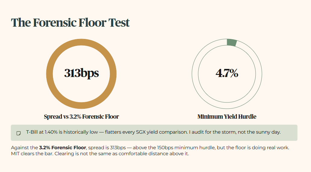 Note on the Stress-Test Buffer: For this audit, I apply a conservative floor of 3.2 percent. We audit for the storm, not just the sunny day. The T-Bill is currently sitting at a historically low 1.40 percent, which flatters every yield comparison on the SGX. I do not lower my standards to match a temporary market dip. Against my 3.2 percent Forensic Floor, MIT’s yield spread is 313 basis points — still above the 150 basis point minimum hurdle, but the floor is doing real work here. The minimum yield hurdle is 4.7 percent. MIT clears it. That is the pass. But clearing the bar is not the same as comfortable distance above it.