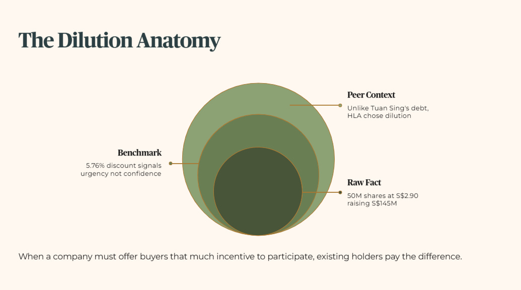 Layer 3 — Peer Context: Unlike Tuan Sing, which has managed its capital structure through debt rather than equity issuance, Hong Leong is choosing dilution over leverage. That preserves the balance sheet in the short term but transfers the cost directly to current shareholders.