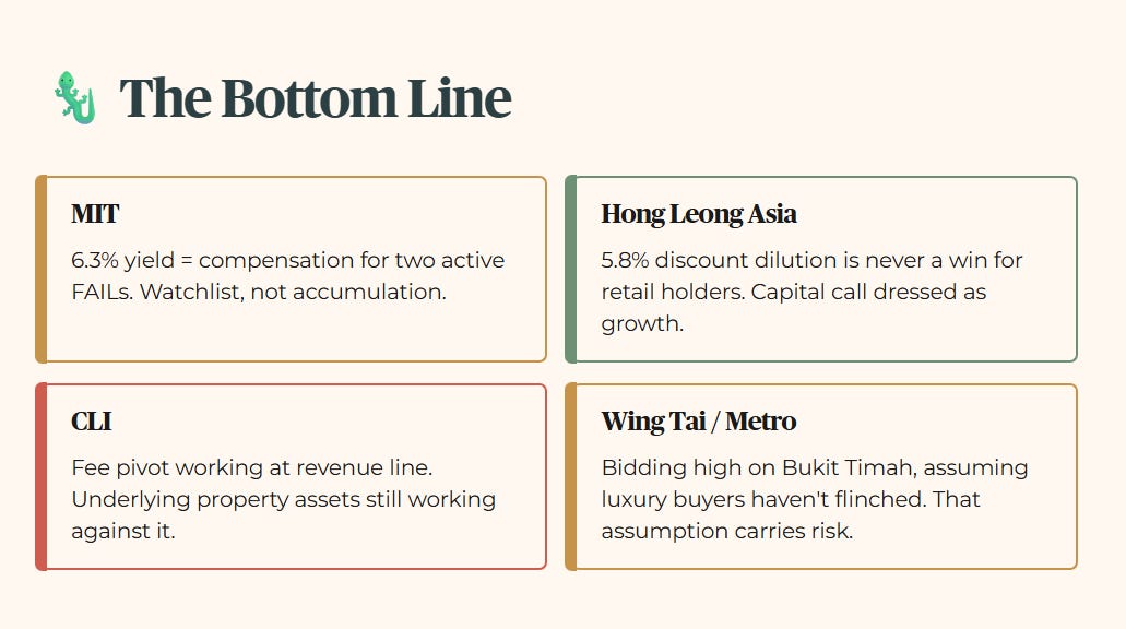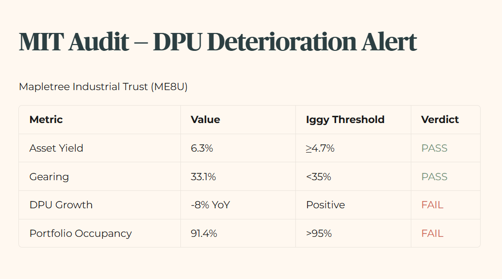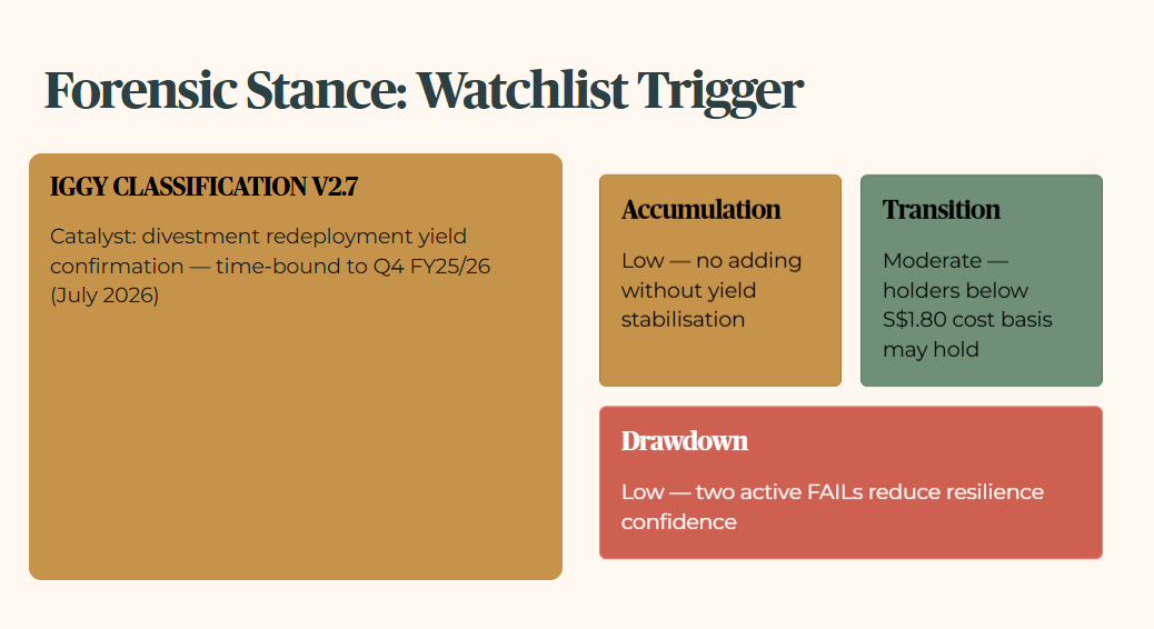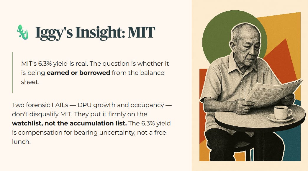 MIT’s 6.3% yield is real. The question is whether it is being earned or borrowed from the balance sheet. An 8% DPU cut while offloading S$600 million in assets tells you management is prioritising financial stability over unitholder income — and that is not necessarily wrong. But for a retiree in Toa Payoh counting on that quarterly cheque, the difference between “managed decline” and “structural weakness” is not an accounting concept. It is the gap between covering your utilities or not. Two forensic FAILs in a single audit — DPU growth and occupancy — do not disqualify MIT. They put it firmly on the watchlist, not the accumulation list. The 6.3% yield is compensation for bearing that uncertainty, not a free lunch.