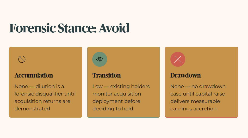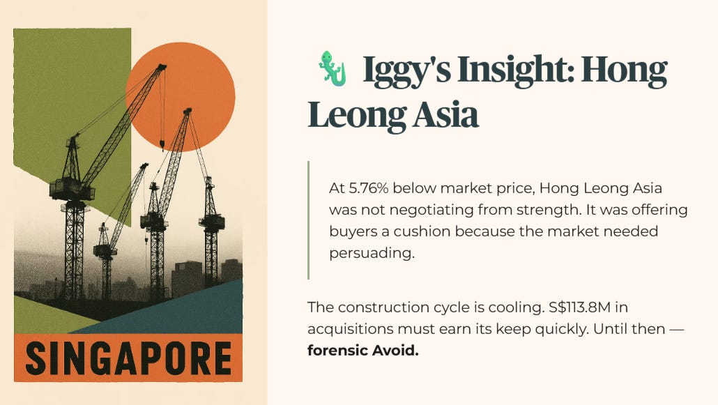 A placement is not automatically bad news. Sometimes a company raises equity because it sees a genuinely accretive opportunity and wants to move fast. But the forensic tell is the discount. At 5.76% below the market price, Hong Leong Asia was not negotiating from strength. It was offering buyers a cushion because the market needed persuading. For the retail holder in Punggol who did not get to participate in the placement, that persuasion came at their expense. The construction cycle in Singapore is cooling, and S$113.8M in acquisitions needs to earn its keep quickly. Until there is evidence that the capital has been deployed at a return above the dilution cost, this is a forensic Avoid.