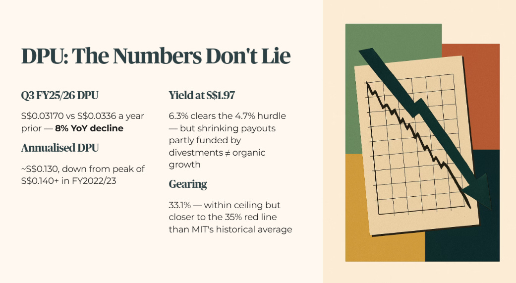 Layer 1 — Raw Fact: MIT posted a Q3 FY25/26 DPU of S$0.03170, against S$0.0336 in the same quarter a year prior. That is an 8% year-on-year decline in cash returned to unitholders.