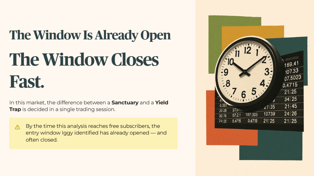 The Window Closes Fast. In this market, the difference between a “Sanctuary” and a “Yield Trap” is decided in a single trading session. By the time this analysis reaches you as a free subscriber, the entry window Iggy identified has already opened — and often closed.