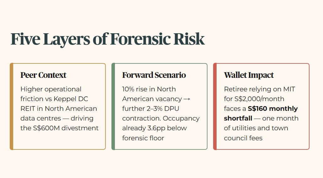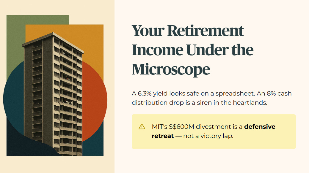 Layer 5 — Wallet Impact: A 60-year-old retiree in Toa Payoh relying on MIT for S$2,000 monthly income would see a S$160 shortfall from the DPU compression alone. That is one month of utilities and town council fees. The yield passes the hurdle. The trajectory does not.