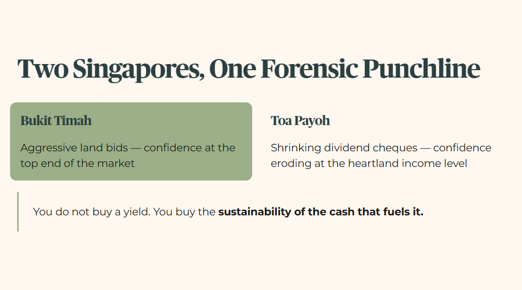 Today we see aggressive land bids in Bukit Timah set against shrinking dividend cheques in Toa Payoh. Same Singapore, two very different stories about where confidence is sitting right now.
