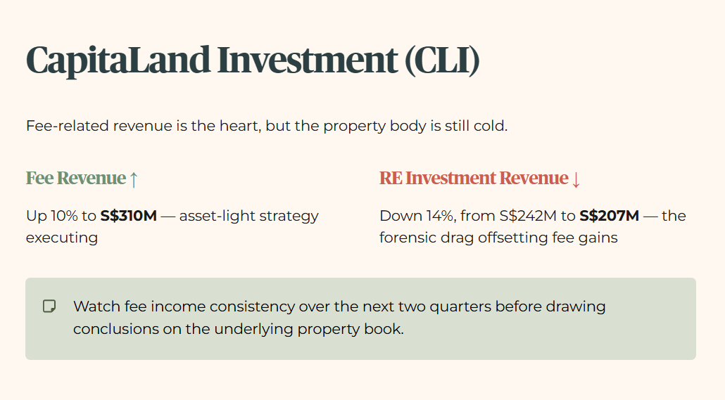Fee revenue up 10% to S$310M shows the asset-light strategy is executing. But the 14% drop in real estate investment revenue — down S$242M to S$207M — is the forensic drag that offsets it. For a 55-year-old PMET in Jurong, the pivot is defensible as a business model transition, but it limits capital appreciation upside in the near term. Watch for fee income consistency over the next two quarters before drawing conclusions about the underlying property book.