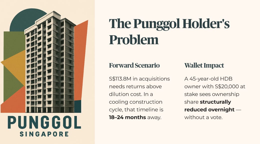 Layer 5 — Wallet Impact: A 45-year-old HDB owner in Punggol with a S$20,000 stake sees their ownership share diluted overnight. That is not a paper loss from market movement — it is a structural reduction in their claim on the company’s future earnings, decided without their vote.
