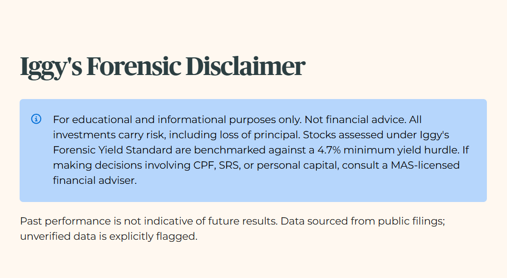 This content is produced for educational and informational purposes only. I am not a financial advisor — I am a retail investor who applies forensic analysis to my own portfolio and shares that process publicly. Nothing here constitutes a recommendation to buy, sell, or hold any security, and no specific target prices or personalised financial advice are offered. Stocks assessed under Iggy’s Forensic Yield Standard are benchmarked against a 4.7% minimum yield hurdle; stocks flagged as Growth Watch fall below this threshold but demonstrate clean balance sheet metrics and an identifiable growth catalyst — these carry a materially different risk profile and are not suitable as yield replacements for income-dependent investors. All data is sourced from public filings and verified sources; where data is unverified it is explicitly flagged. All investments carry risk, including the potential loss of principal, and past performance is not indicative of future results. If you are making investment decisions involving CPF, SRS, or personal capital, please conduct your own due diligence or consult a MAS-licensed financial adviser before committing funds.