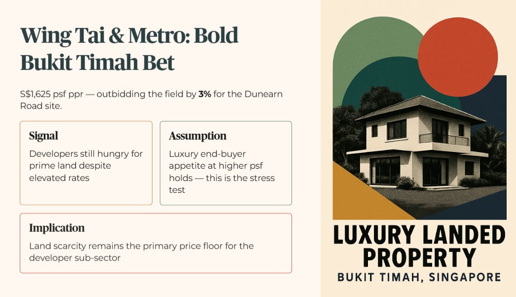 Wing Tai and Metro outbid the field by 3% for the Dunearn Road site. Developers are still hungry for prime land despite elevated rates. For a 50-year-old in Bukit Timah, this confirms that luxury land scarcity remains the primary price floor for the developer sub-sector. The end-buyer appetite at higher psf is the assumption being stress-tested here — and developers are betting it holds.