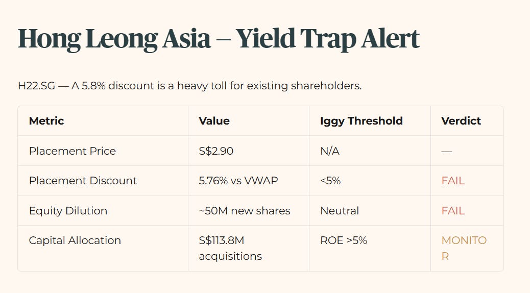 Hong Leong Asia: Dilution at a 5.8% discount is never a win for existing retail holders. It is a capital call dressed as a growth move.