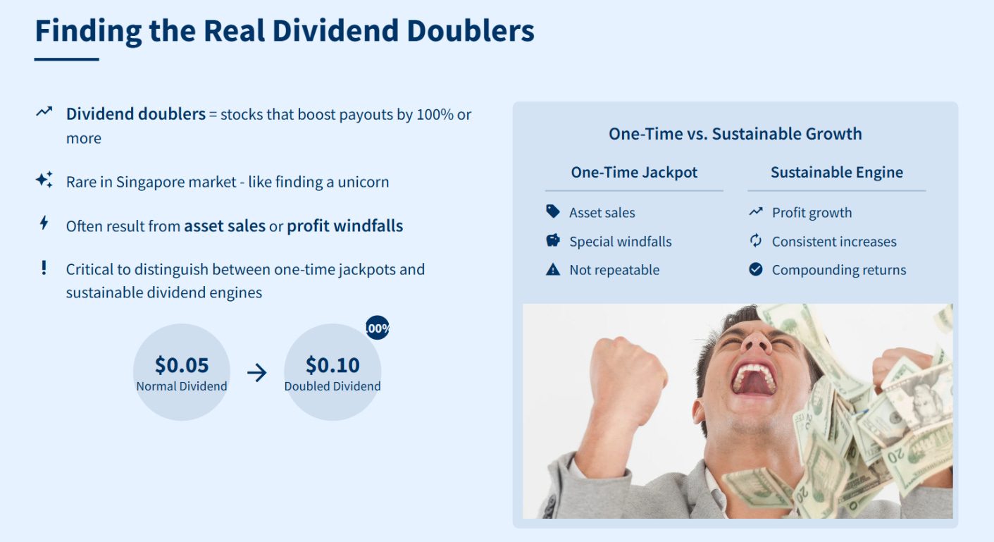 Most Singapore blue-chips raise payouts by low double digits each year—think small bumps you can count on. But true dividend doublers, where payouts jump by 100% or more, are almost mythical. It’s like finding a unicorn in the stock market—a rare sight, unless special circumstances line up.
