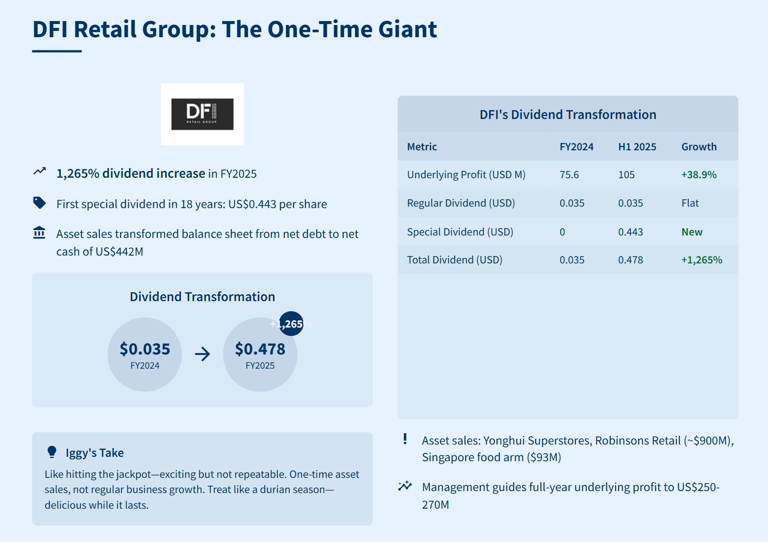 DFI Retail Group tops the list with an eye-popping 1,265% dividend increase in FY2025. The company declared its first special dividend in 18 years: US$0.443 alongside a regular US$0.035 interim payout, for US$0.478 per share total.