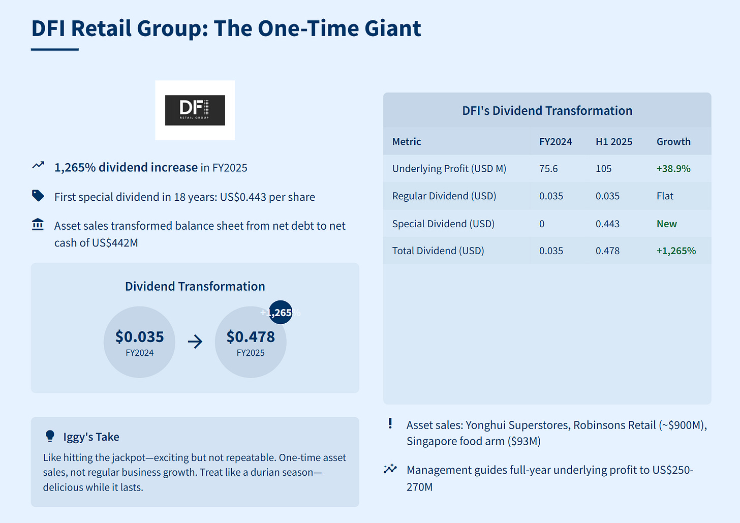 This table illustrates how strategic asset sales enabled DFI to return a massive one-time dividend beyond its regular interim payout. Future growth will hinge on ordinary dividends once the one-off proceeds are spent.