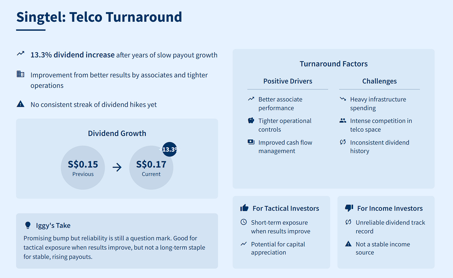 Think of it like a food stall that suddenly improves its dishes for a season—you’ll enjoy the boost right now, but there’s no promise the quality will always keep getting better. So if you’re looking for a stock that grows your income steadily year after year, Singtel may not be your best pick. This jump is worth celebrating, but only for investors who are comfortable with ups and downs.