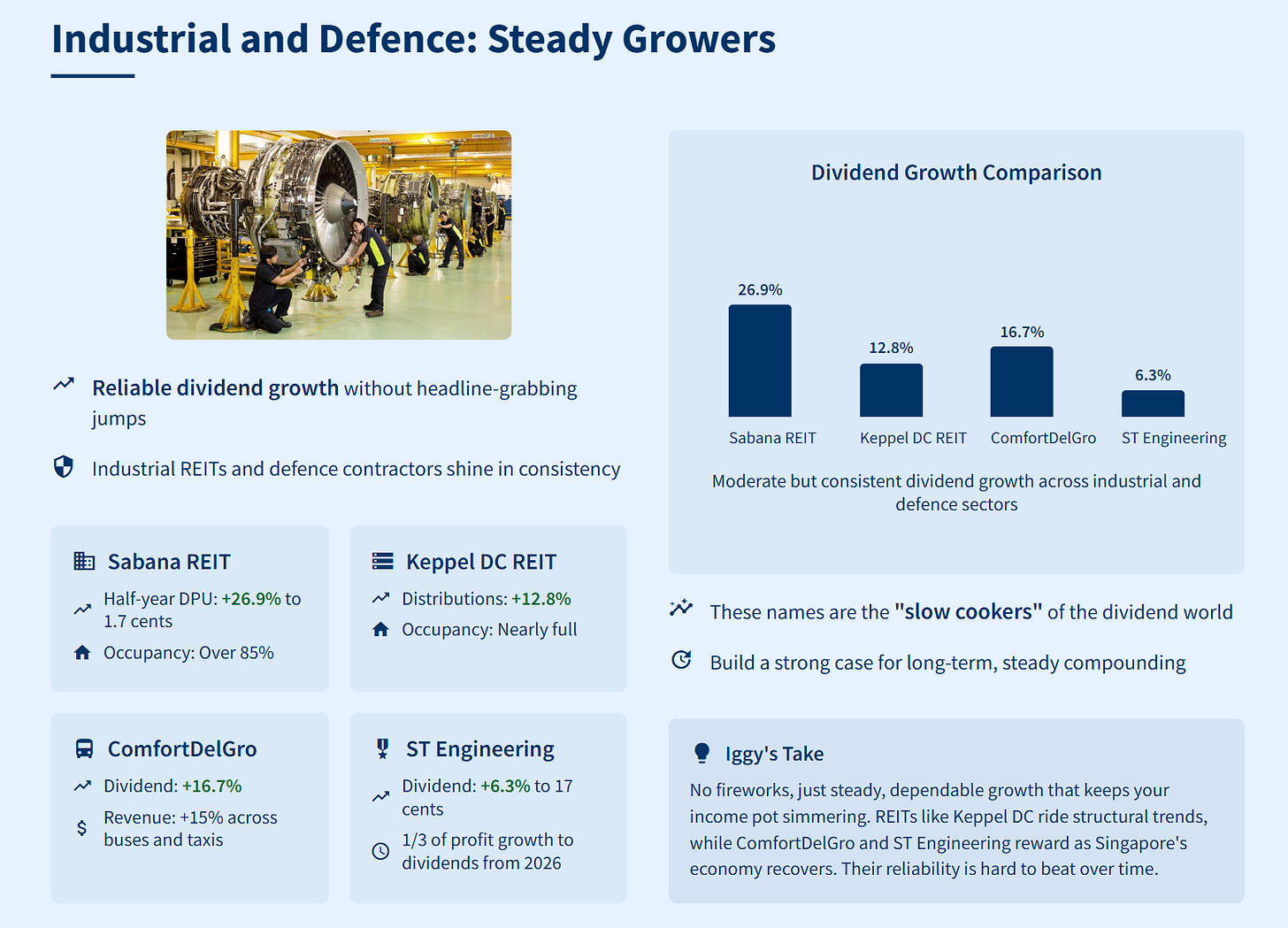 These names are the “slow cookers” of the dividend world—no fireworks, just steady, dependable growth that keeps your income pot simmering. REITs like Keppel DC are great for riding structural trends (think data centres), while ComfortDelGro and ST Engineering reward you as Singapore’s economy recovers and grows. If you want extra security in your portfolio, mix in these steady growers. They may not wow you in any single year, but over time, their reliability is hard to beat.