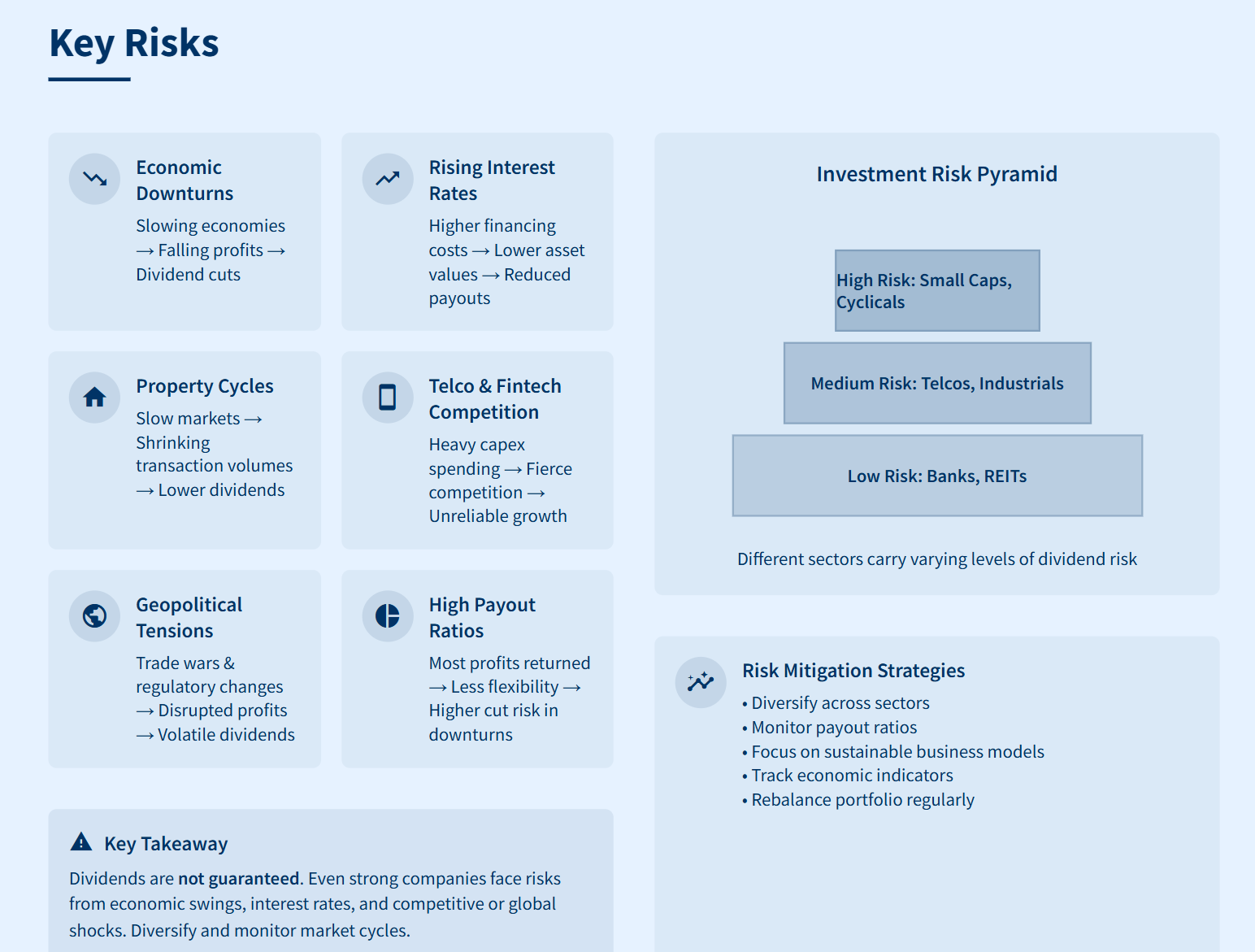 Dividends are not guaranteed. Even strong companies face risks from economic swings, interest rates, and competitive or global shocks. It’s wise to diversify and keep an eye on market cycles—what looks safe today might not be tomorrow.