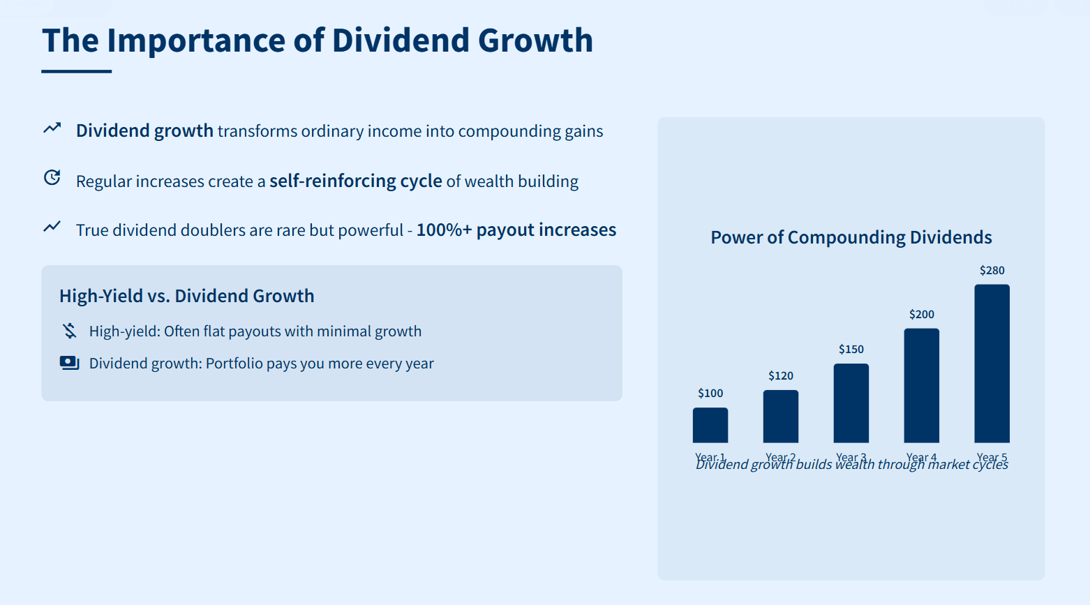 Why does this matter? If you rely only on high-yield stocks, you might get stuck with flat payouts and minimal growth. But if you find companies that can grow their dividends for years, you’ll build a portfolio that pays you more every year—no matter how markets swing.