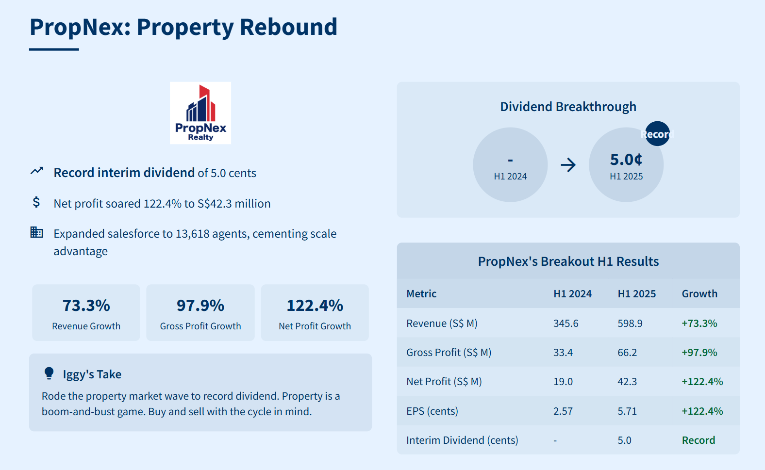 PropNex’s profit boom translated into a record interim dividend of 5.0 cents, its highest ever. H1 2025 net profit soared 122.4% to S$42.3 million, while revenue leapt 73.3% to S$598.9 million and gross profit nearly doubled to S$66.2 million. Earnings per share climbed from 2.57 cents to 5.71 cents as the property market recovery drove transaction volumes. PropNex also expanded its salesforce to 13,618 agents, cementing its scale advantage.