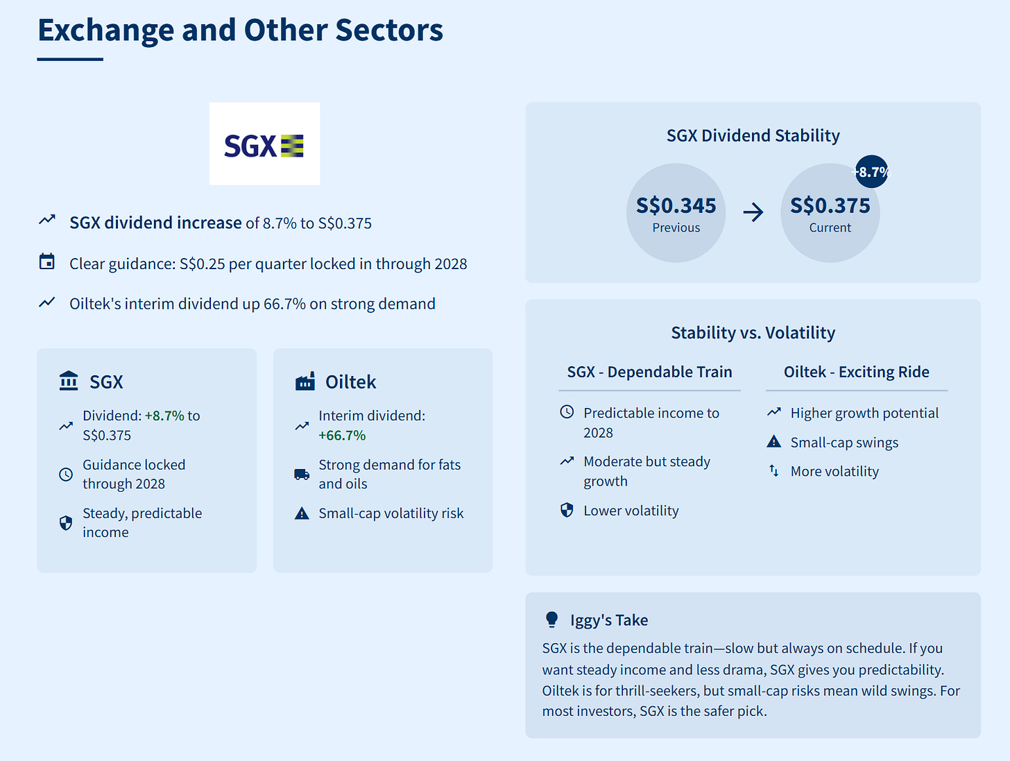 These companies broaden your options beyond the usual dividend players. SGX gives you a steady income stream with future certainty—perfect for cautious, income-focused investors. Oiltek is proof that niche players can win big when the stars align, though the risks are higher.