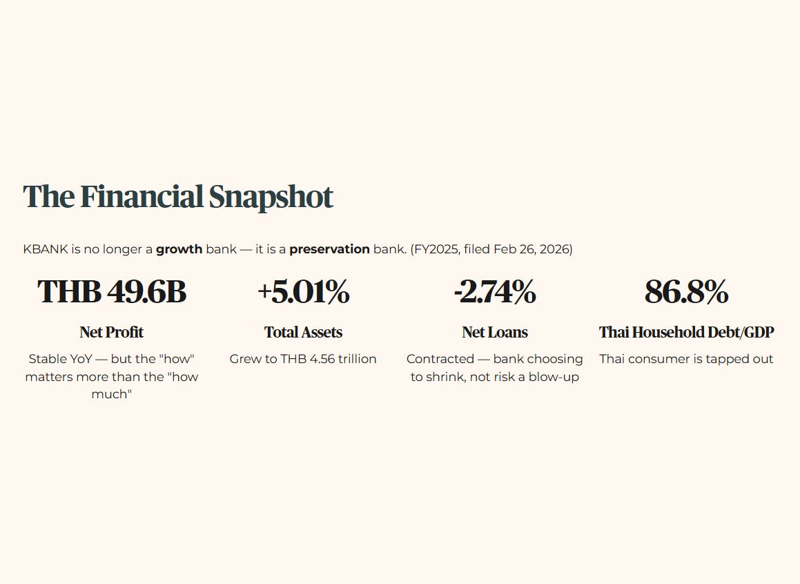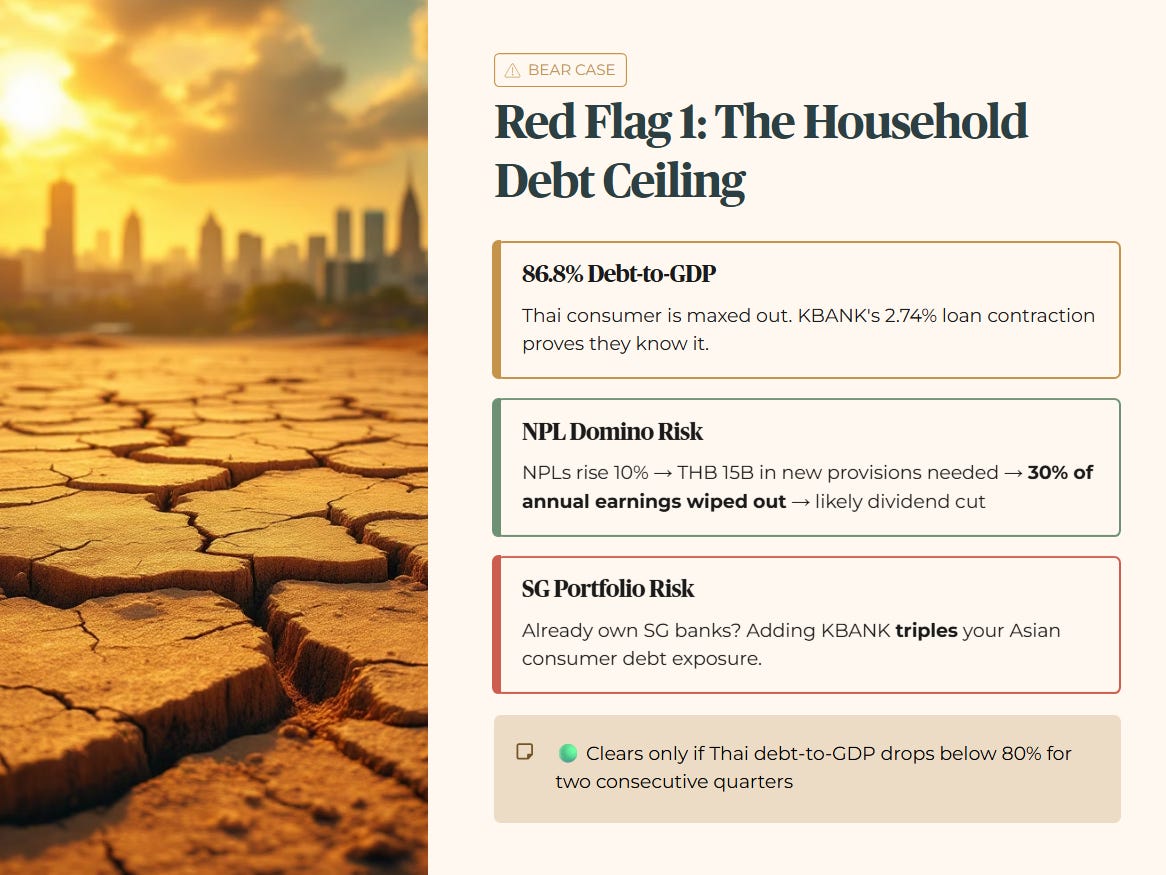 The most dangerous risk is the 86.8% household debt-to-GDP ratio in Thailand. The Thai consumer is maxed out, and KBANK’s 2.74% loan contraction proves they know it.
