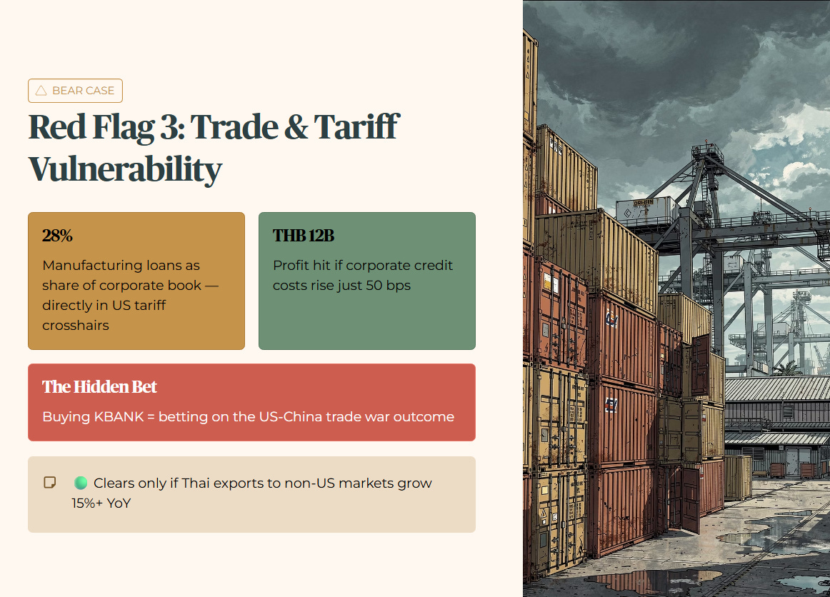 KBANK is a proxy for the Thai economy, and the Thai economy is a proxy for global trade. With US tariffs looming in 2026, Thailand’s export-heavy manufacturing sector is in the crosshairs. Manufacturing loans make up 28% of the corporate book.
