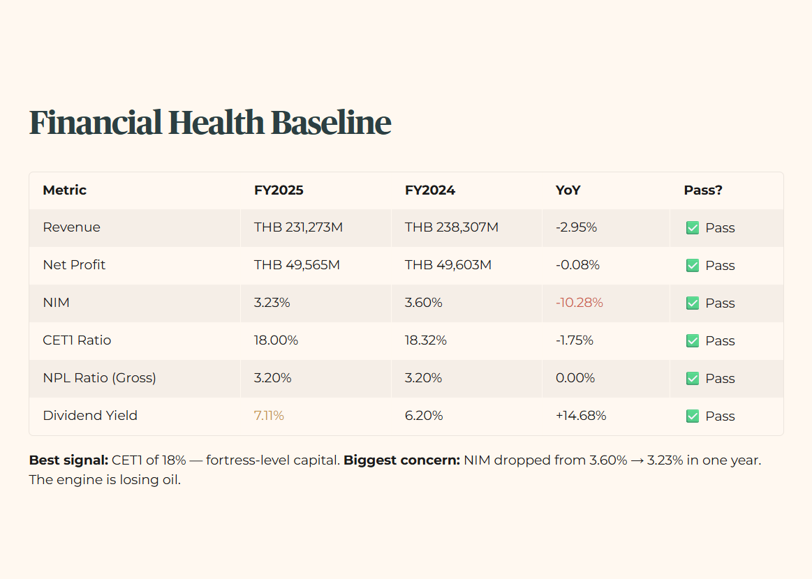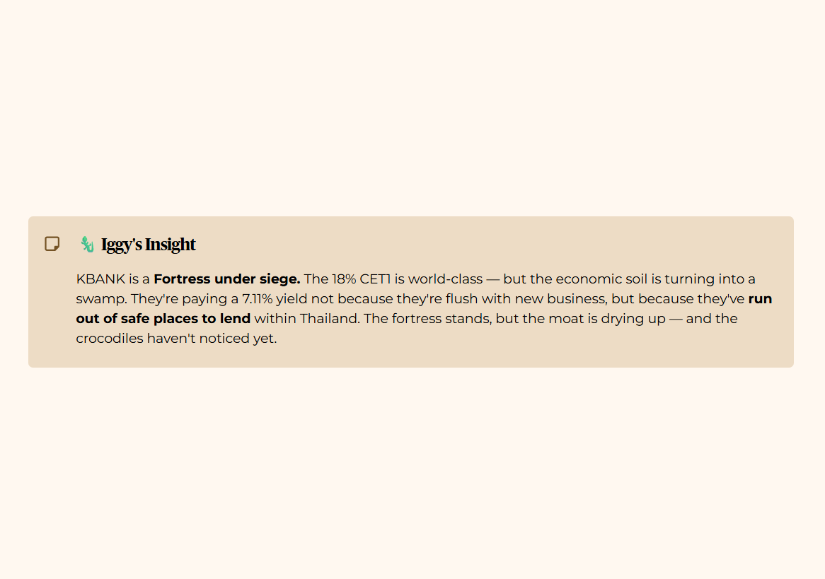 KBANK is currently a Fortress under siege. Management has built a massive wall of capital—that 18.00% CET1 ratio is world-class—but the surrounding economic soil is turning into a swamp. They are paying out a 7.11% yield not because they are swimming in extra cash from new business, but because they’ve run out of safe places to lend it within Thailand. It’s a strategic retreat disguised as a dividend bonanza. The fortress is standing, but the moat is drying up—and the crocodiles have not noticed yet.