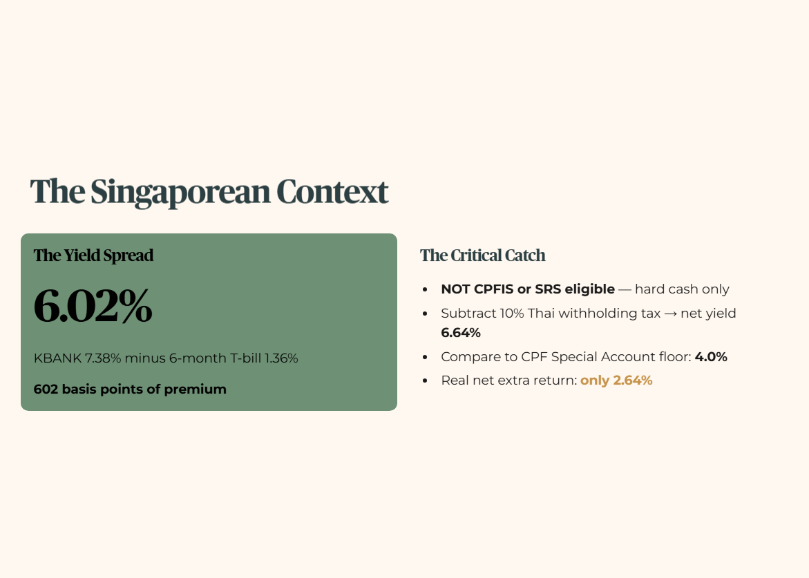For a retiree in Ang Mo Kio managing a cash portfolio, this spread looks like a “must-buy.” However, apply the Five-Layer Rule to that yield. You must subtract the 10% Thai Withholding Tax, bringing your net yield to 6.64%. Then, compare it to the 4.0% risk-free rate of the CPF Special Account. You are taking “Emerging Market” risk for a net “extra” return of only 2.64%.